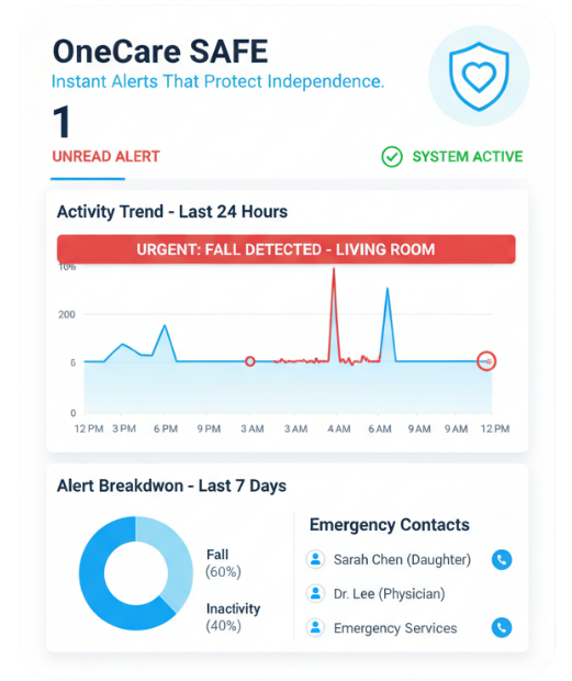 OneCare SAFE is a discreet, non-wearable fall-detection system that provides 24/7 monitoring and real-time alerts. It ensures help is always close when it matters most.